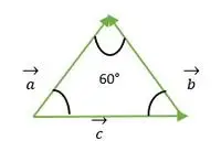 Per i vettori a e c, la coda di entrambi i vettori coincide tra loro, quindi l'angolo tra i vettori a e c è uguale all'angolo tra due lati del triangolo equilatero = 60°.