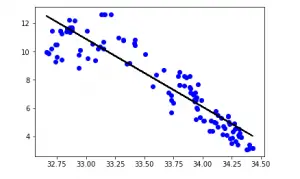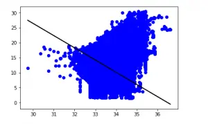 y_pred> => regr.predict(X_test)> plt.scatter(X_test, y_test, color> => 'b'> )> plt.plot(X_test, y_pred, color> => 'k'> )> > plt.show()> |