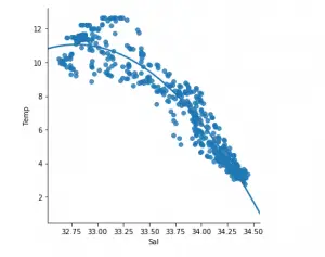 df_binary500> => df_binary[:][:> 500> ]> > # Selecting the 1st 500 rows of the data> sns.lmplot(x> => 'Sal'> , y> => 'Temp'> , data> => df_binary500,> > order> => 2> , ci> => None> )> |