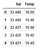 df> => pd.read_csv(> 'bottle.csv'> )> df_binary> => df[[> 'Salnty'> ,> 'T_degC'> ]]> > # Taking only the selected two attributes from the dataset> df_binary.columns> => [> 'Sal'> ,> 'Temp'> ]> #display the first 5 rows> df_binary.head()> |